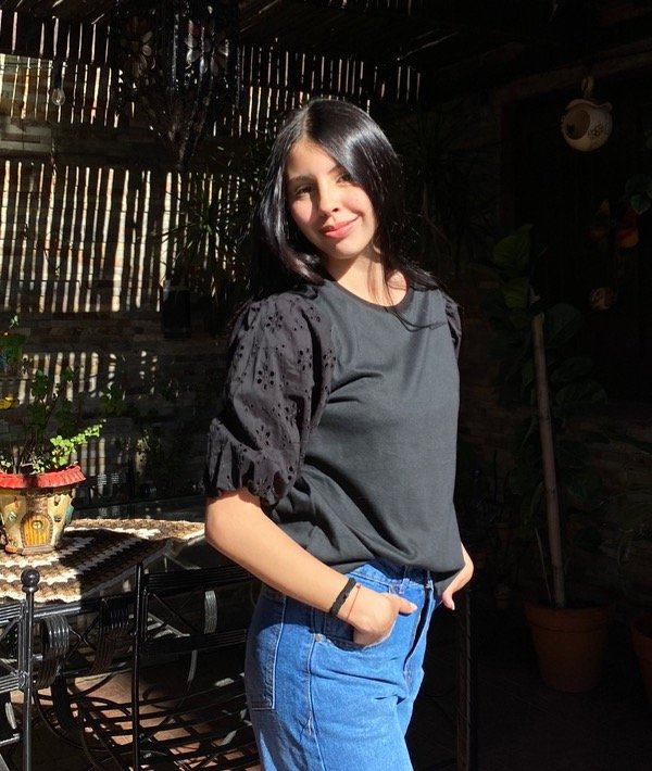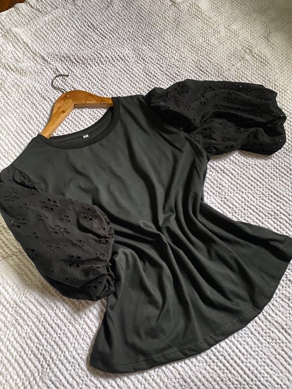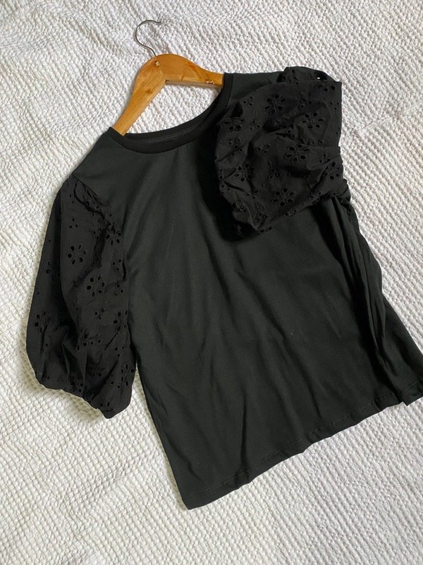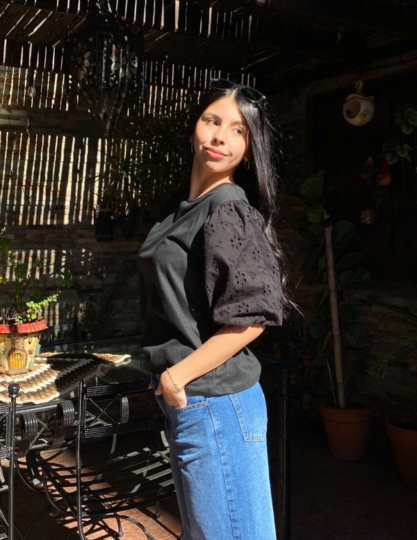 Remera confeccionada en jersey con mangas ballon en broderie. Combinado con Jean Roma