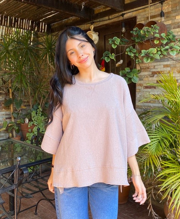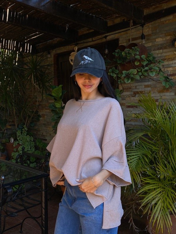 Remeron confeccionado en clonne, modelo amplio manga corta con recortes al corte y tajos laterales. Combinado con Pant Perla y Jean Roma