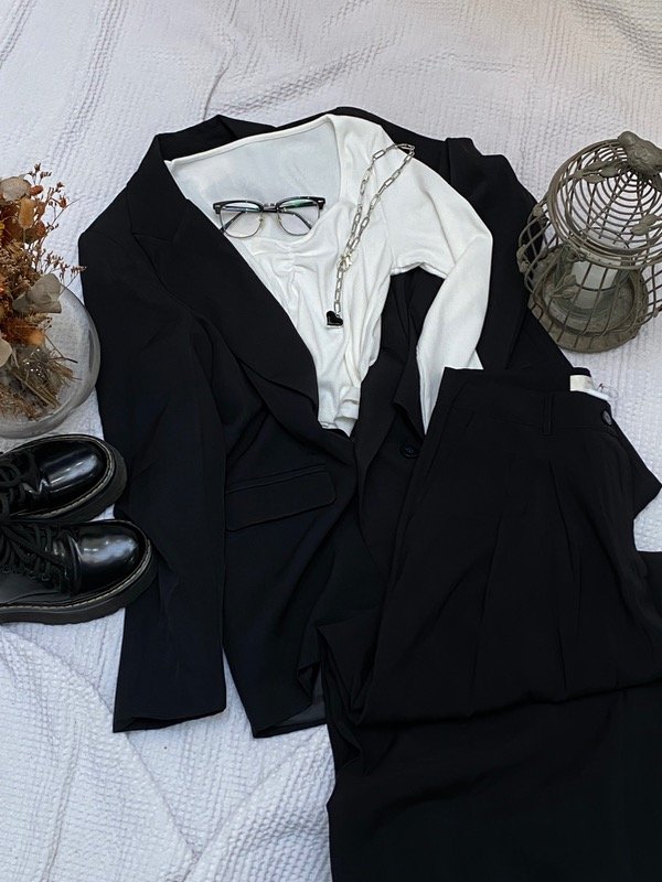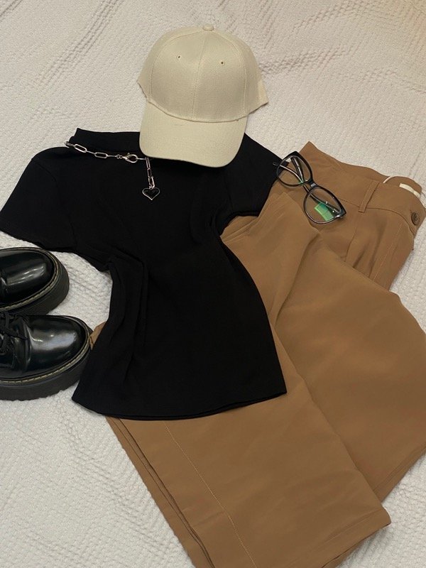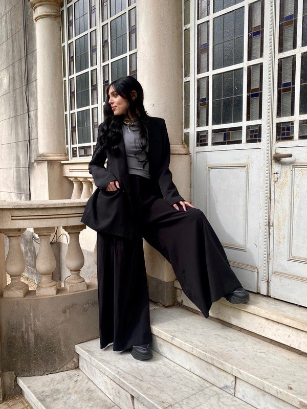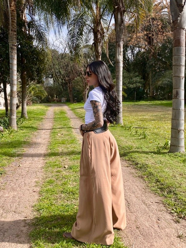 Pantalón sastrero amplio tipo piel de durazno. De corte de wide leg con tablas en delantero, bolsillos y con pinzas de entalle en la espalda.